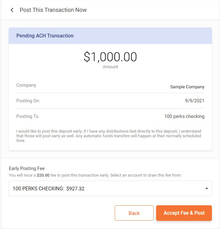 On this screen, you will review the details and make sure everything is correct. At the bottom, you have the option to select from which account the $20.00 early direct deposit will be drawn. Click “Back” if you want to go back to the previous screen or click on the orange “Accept Fee & Post” to post the direct deposit. You are done!